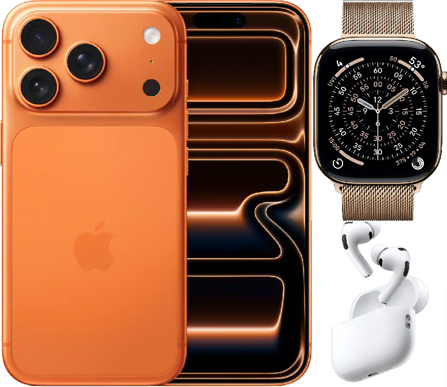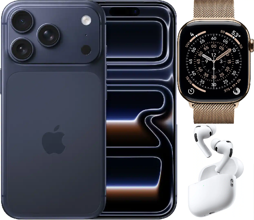 Bundle 256GB Apple iPhone 17 Pro New (Unlocked) Deep Blue | White AirPods Pro 3 | Apple Watch Series 11 (GPS+Cellular) 46mm Titanium Case with Gold Milanese Loop